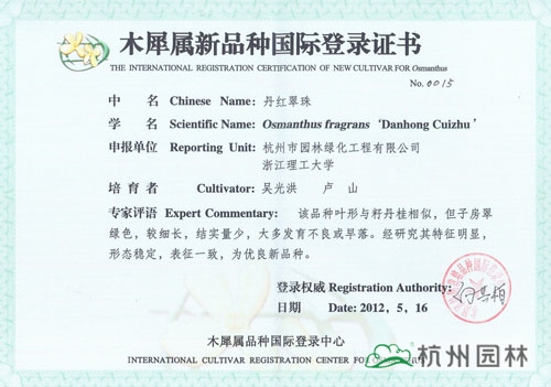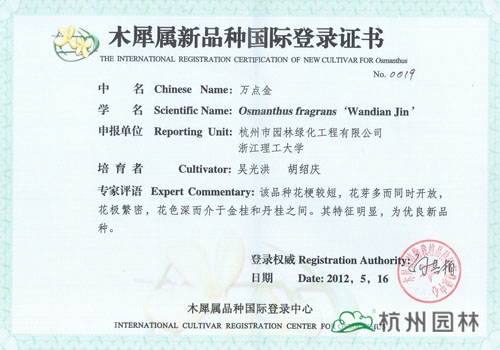 近日,由杭州市园林绿化工程有限公司与浙江理工大学联合研发的“丹红翠珠”、“杭州丹桂”、“杭州黄”、“菊瓣”、“万点金”5个桂花新品种获得木犀属新品种国际登录证书。截止目前,杭州园林已经有12个桂花品种获得此项国际登录权,充分展示了企业在桂花研究方面的突出成绩。