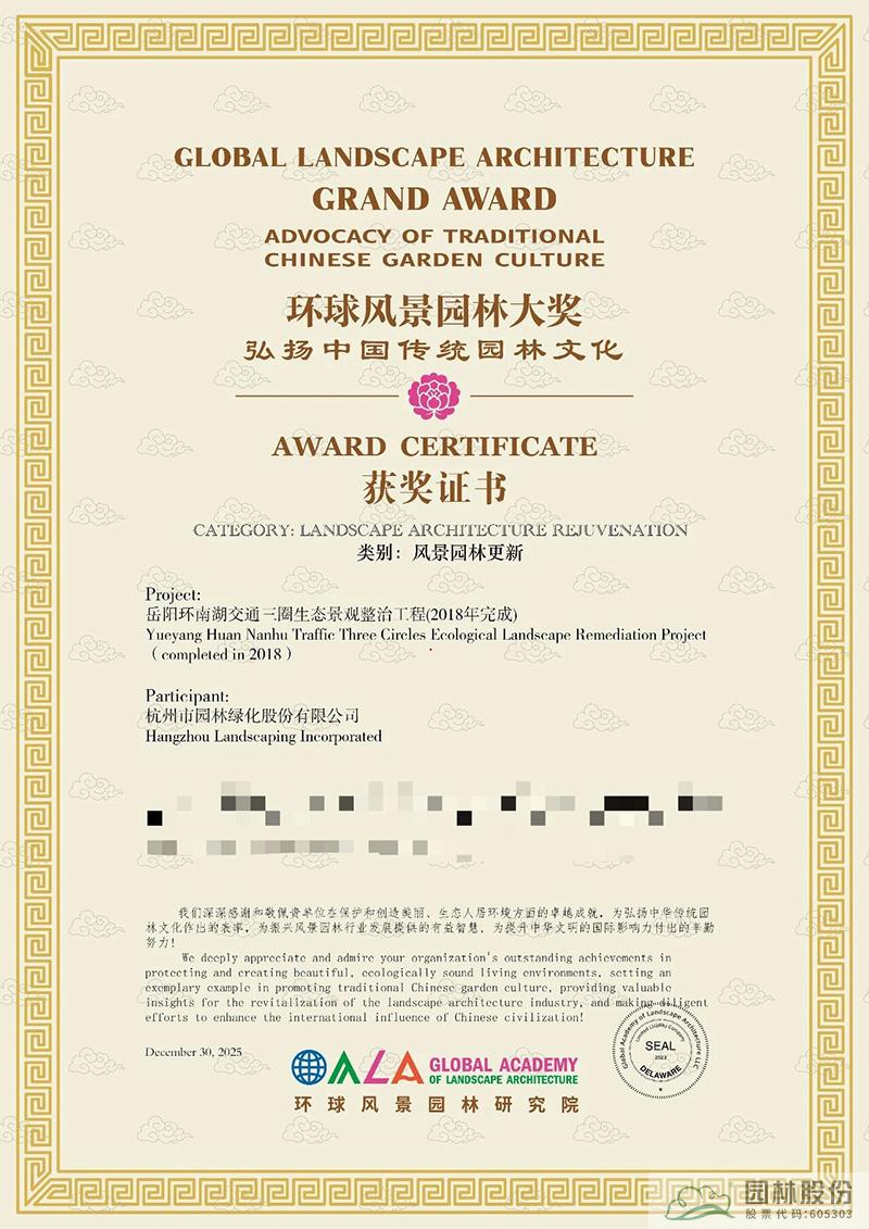 近日,环球风景园林研究院公布 “环球风景园林大奖” 评选结果,杭州市园林绿化股份有限公司承建的岳阳环南湖交通三圈生态景观整治工程、画境园两大精品项目,凭借卓越的设计营造水平与生态文化价值,双双斩获风景园林更新综合类大奖,以硬核实力彰显中国园林企业的专业水准与文化担当!